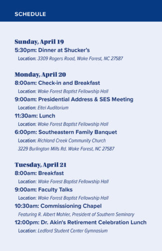 This year we are honoring the Akins’ celebration of their retirement. This spring’s gathering will include a dinner at Shucker’s in Wake Forest, testimonies and updates from our faculty, and precious moments of worship and fellowship with brothers and sisters in Christ.