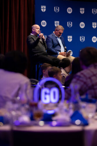 Following his message and a standing ovation Akin sat down on stage with Jonathan Six, vice president for institutional advancement, to answer questions submitted by banquet attendees.